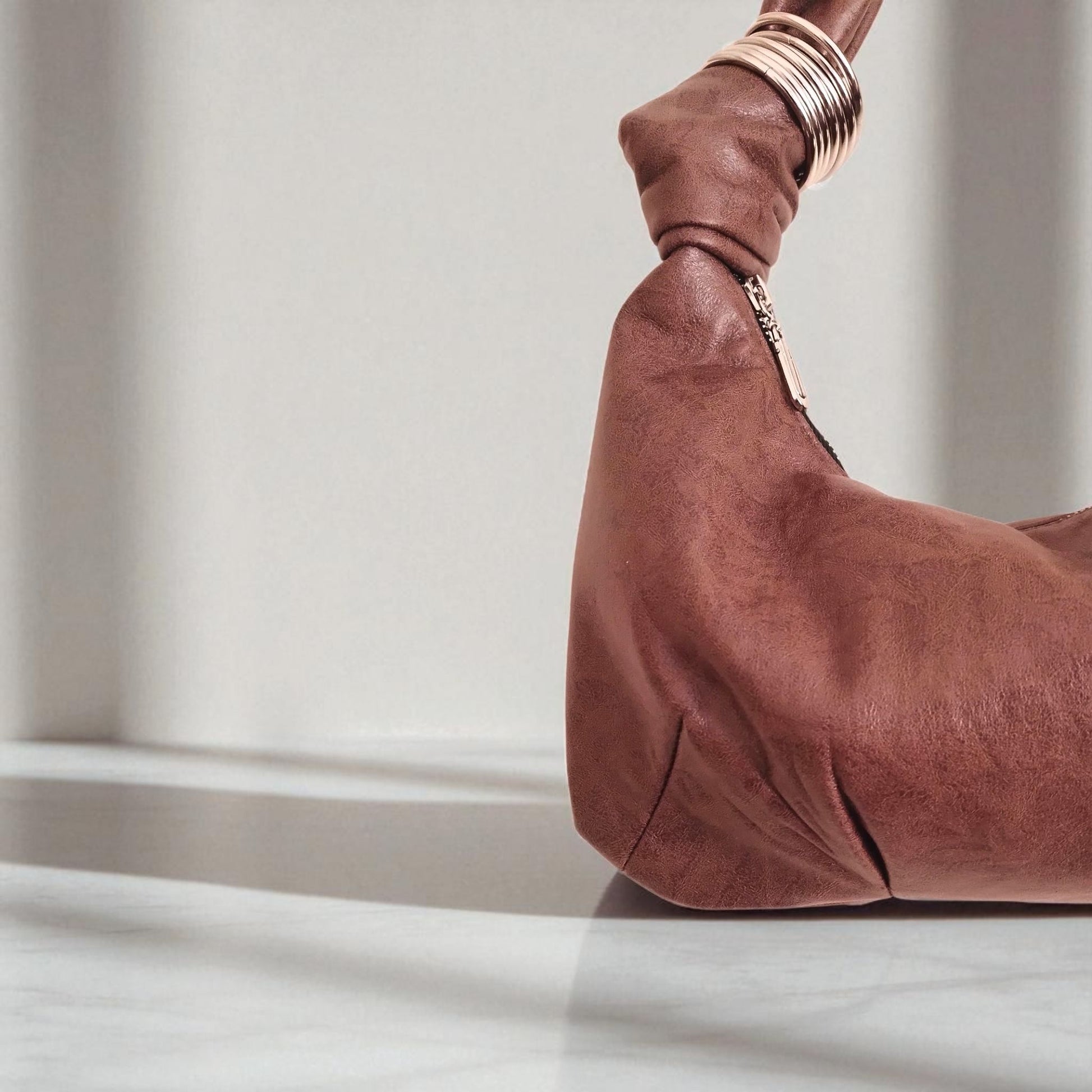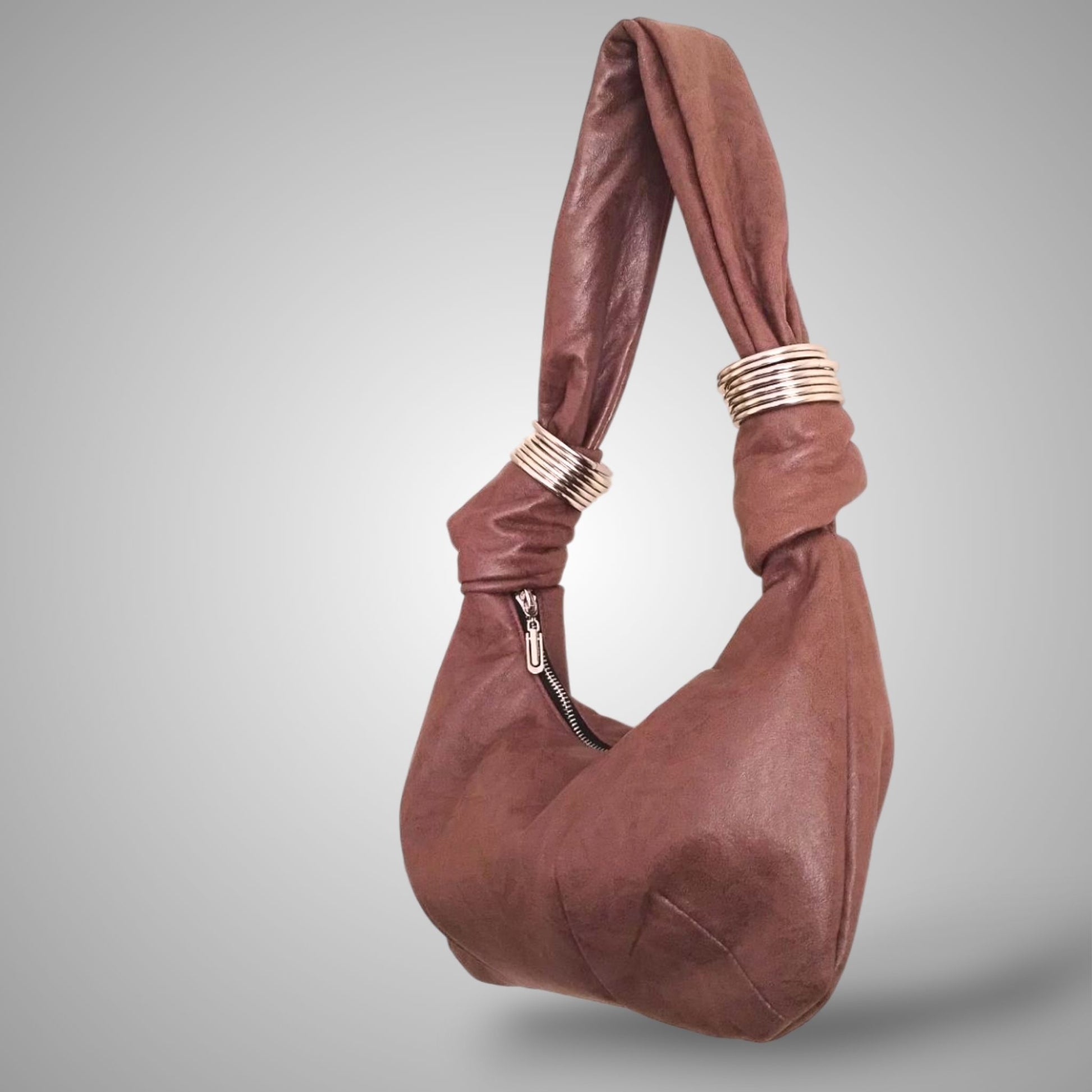 Riziki Hobo is a sculptural shoulder bag designed for effortless impact. Crafted from soft faux leather, its handle is wrapped with stacked silver rings for a touch of shine and edge. The slouchy silhouette makes it perfect for both day and night, with enough room for your essentials and a secure zip closure to keep them in place.