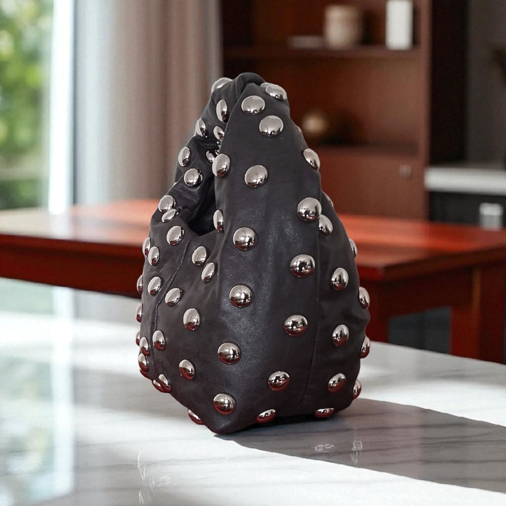 The Studded Twist Bag redefines bold femininity with its curved silhouette, soft structure, and silver 3D dome studs. Crafted in a deep grey tone, this medium-sized handheld bag features a magnetic snap closure and twisted top handle for sculptural carry. Designed for the woman who moves with quiet edge and unapologetic style.